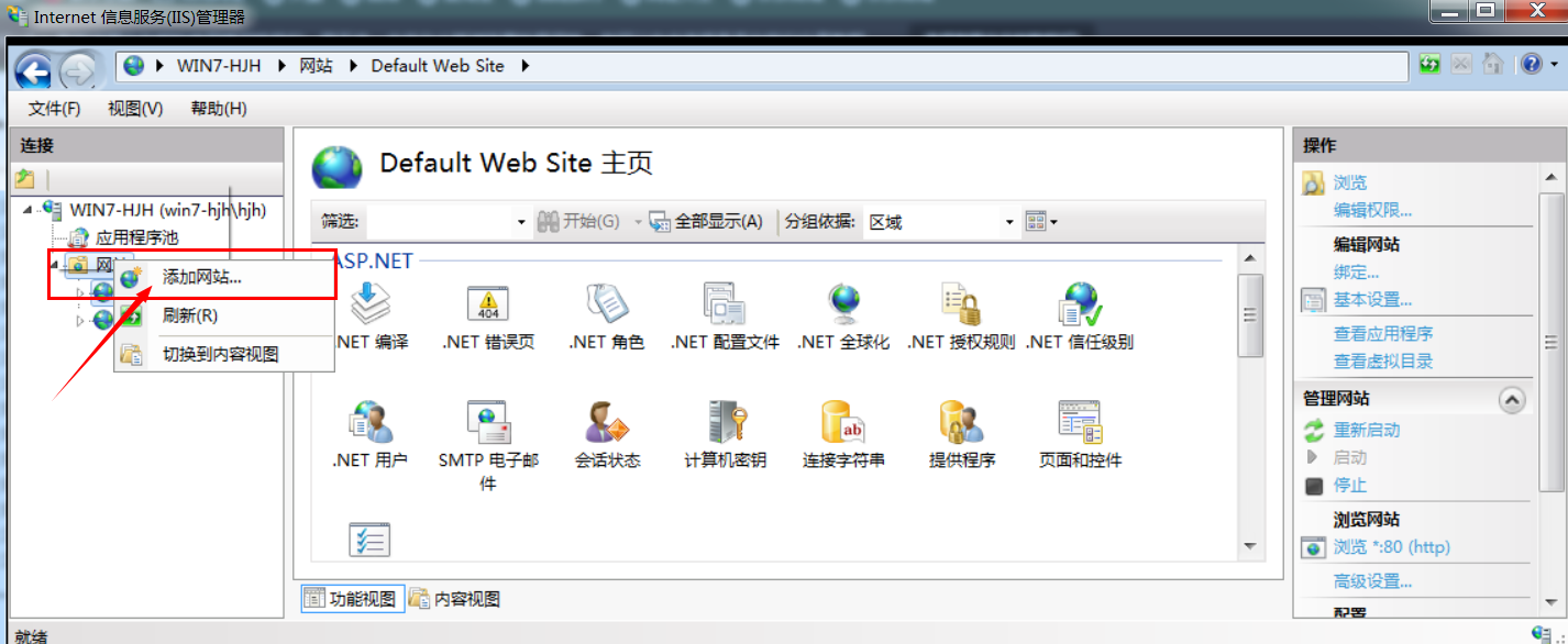 在IIS管理器里面,默认里面有个网站Default Web Site