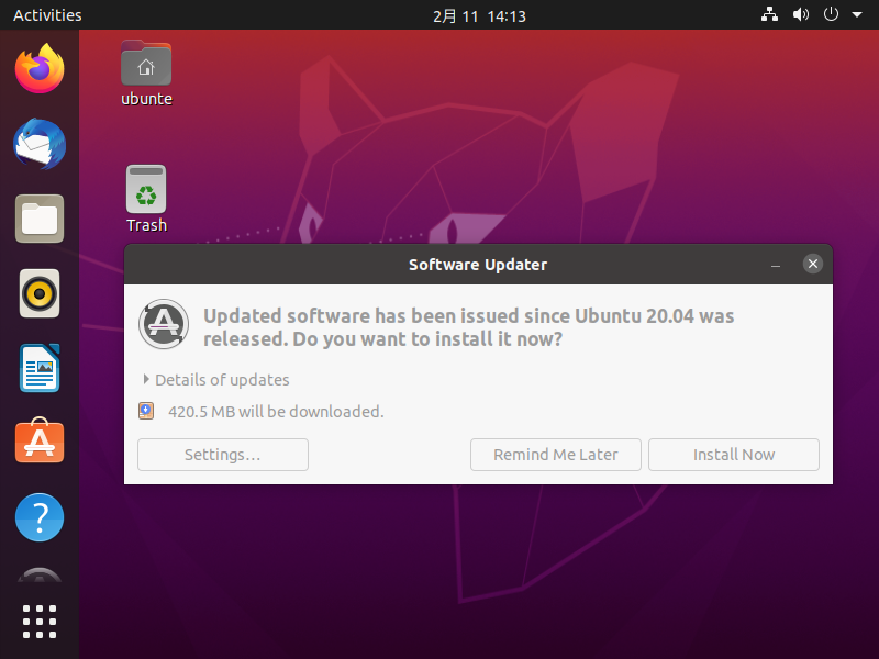 updated software has been issued since ububtu 20.04 was released.do you want to install it now?(自从Ubuntu 20.04发布以来已发布更新的软件。您现在要安装它吗?)