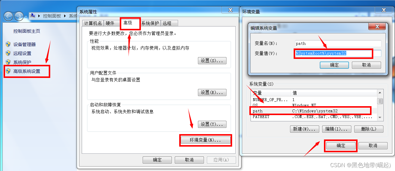 右键单击“计算机”图标,点击“属性”-----点击左侧“高级系统设置”-----进入系统属性窗口后,点击“高级”,点击“环境变量”-----在环境变量列表的“系统变量”中找到Path,并且双击打开该选项进行编辑-----将弹出编辑系统变量中“变量值”更改成“%SystemRoot%\system32”,点击“确定”进行保存