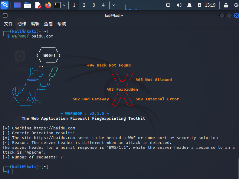 在KaliLinux中提供了一款防火墙探测工具“wafw00f”(这里是数字“00”,千万别搞错了),这个工具可以通过发送正常以及不正常甚至是包含恶意代码的HTTP请求,来探测网站是否存在防火墙,并识别该防火墙的厂商及类型。