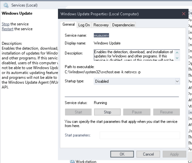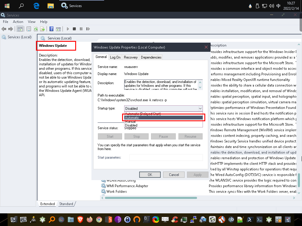 找到windows update,双击,再选择第二个再点击apply,再点击start,再点ok