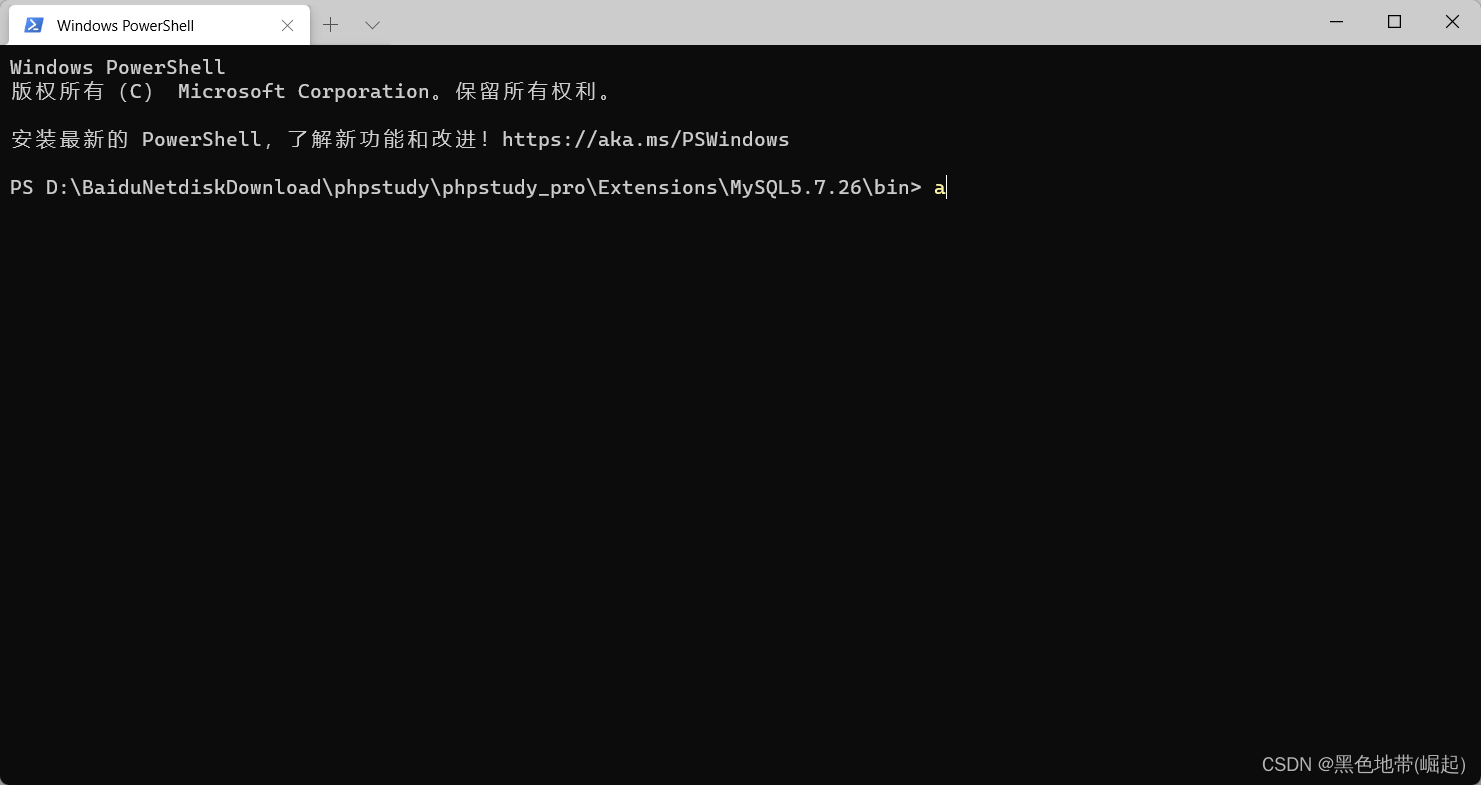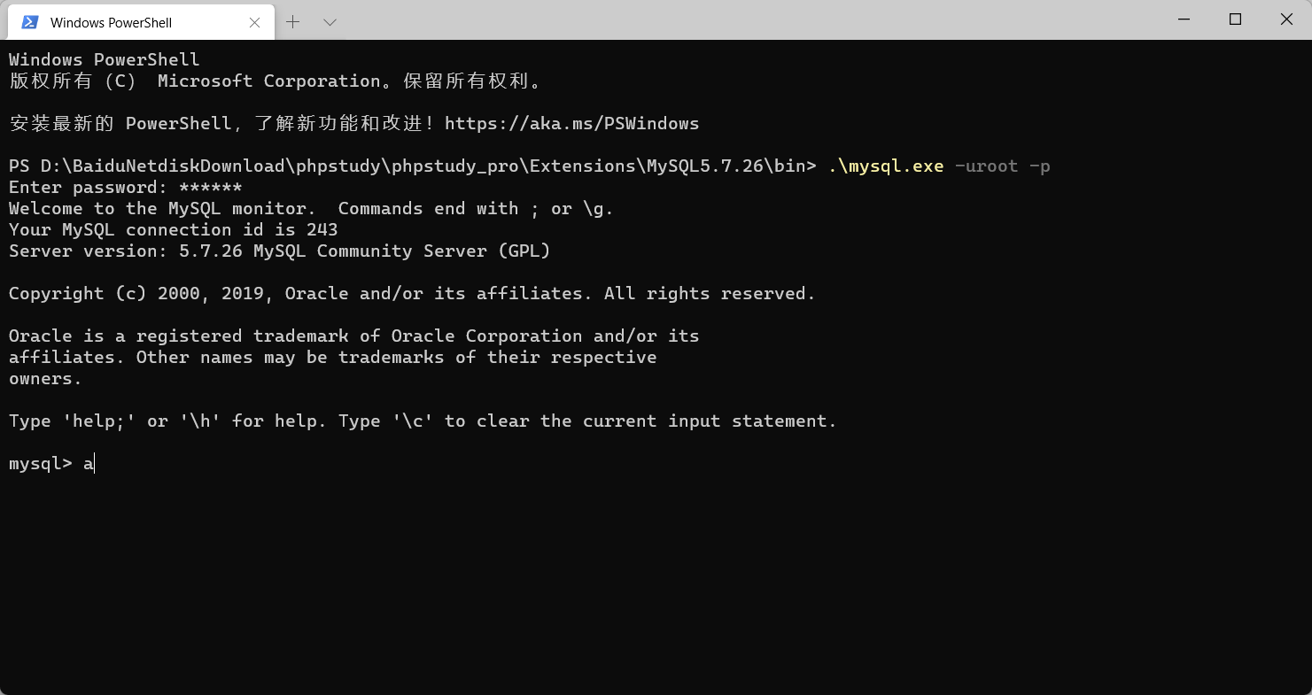 第一步:进入phpstudy的安装目录,进入到.\Extensions\MySQL5.7.26\bin文件夹,里面有一个mysql.exe文件