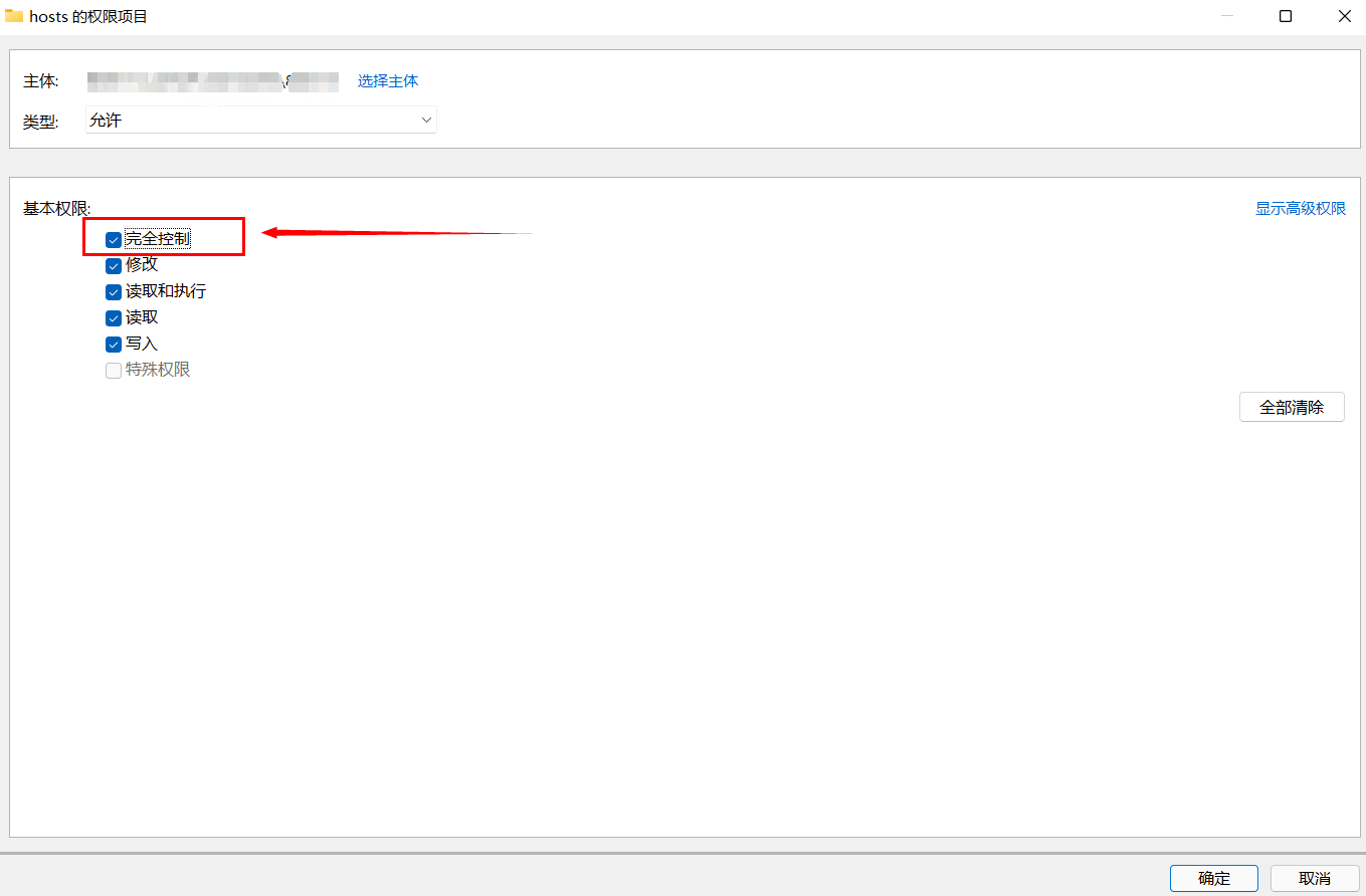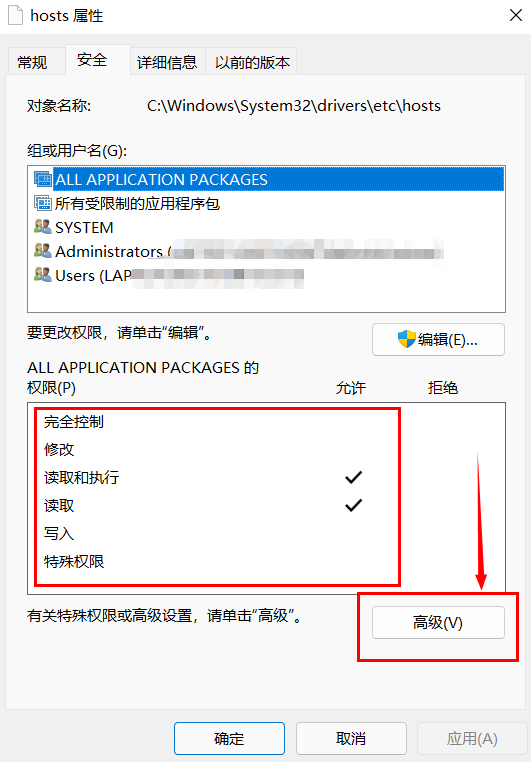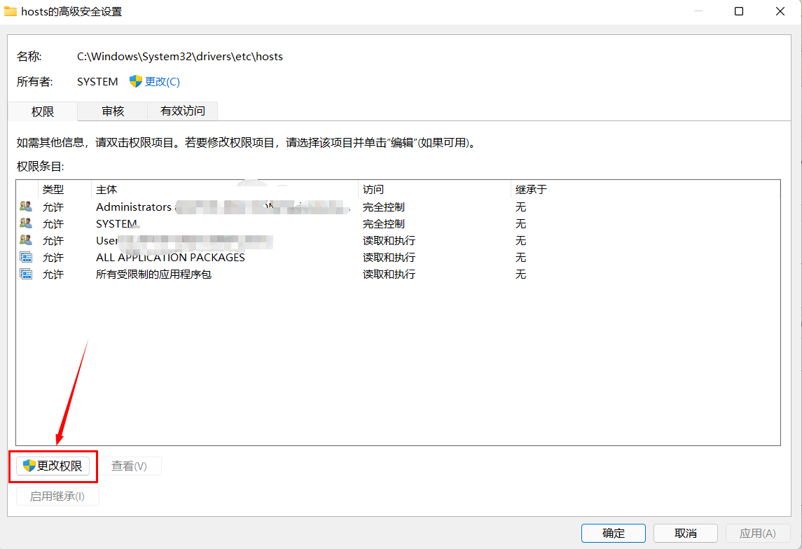 点击安全----->点击高级-------->进入到 hosts的高级安全设置,点击更改权限