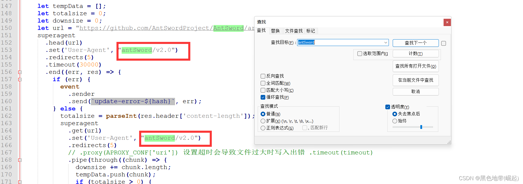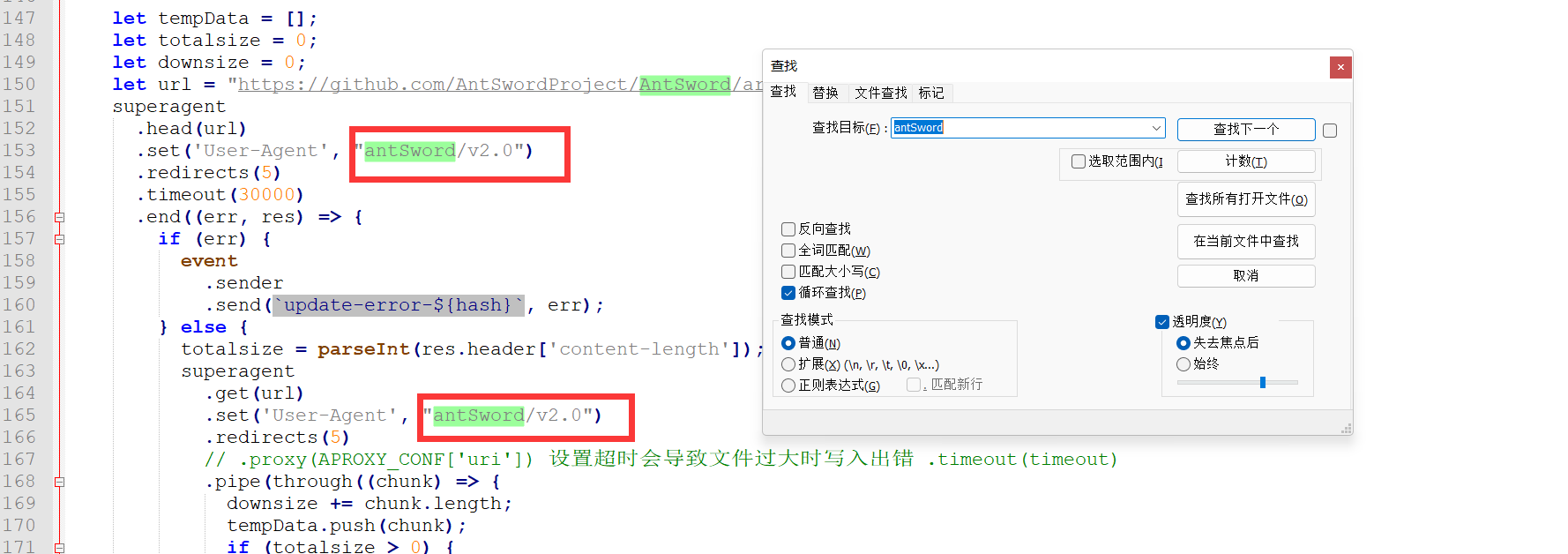 有两处要修改;查找“antSword/v2.0”(153,165行)