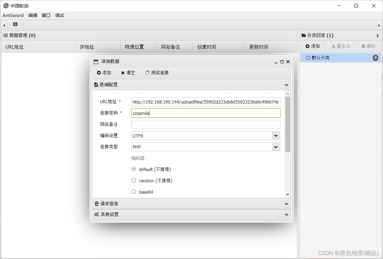 第二步:输入木马地址及密码,添加保存(选个加密方法)