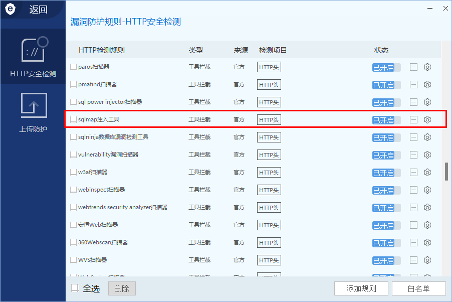 相关注入工具都被列为拦截对象。且根据HTTP头部进行拦截