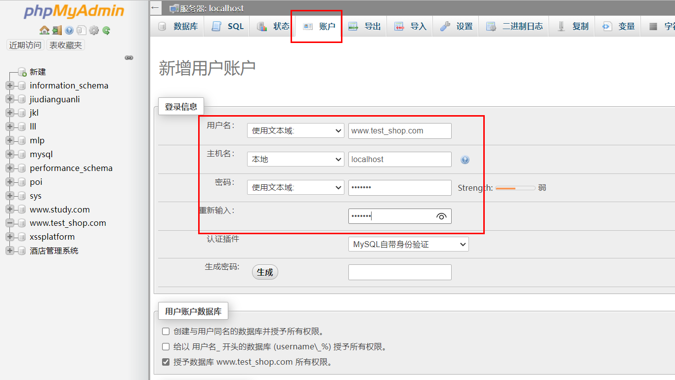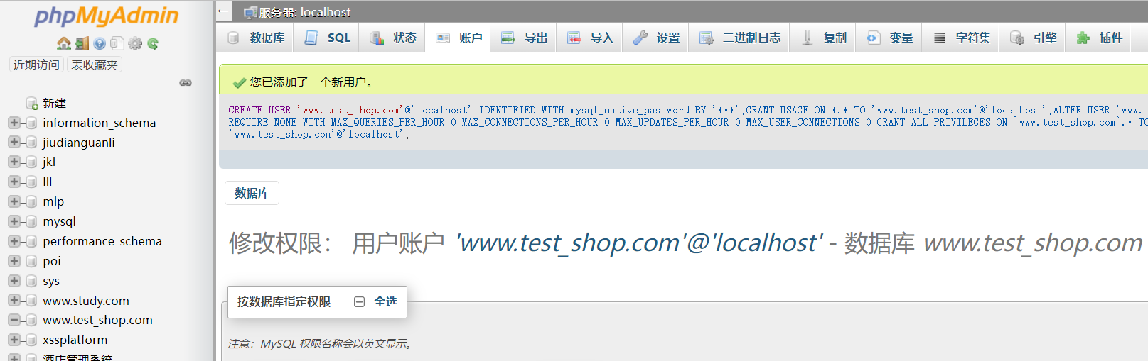 为了方便记,数据库名,和数据库用户名,用一样的方便一些