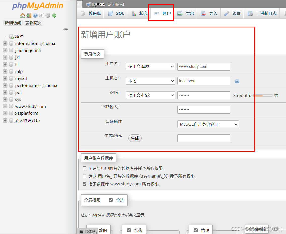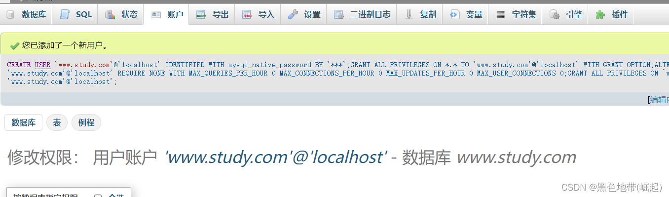 然后在这个新建的数据库中,添加有所有权限的用户