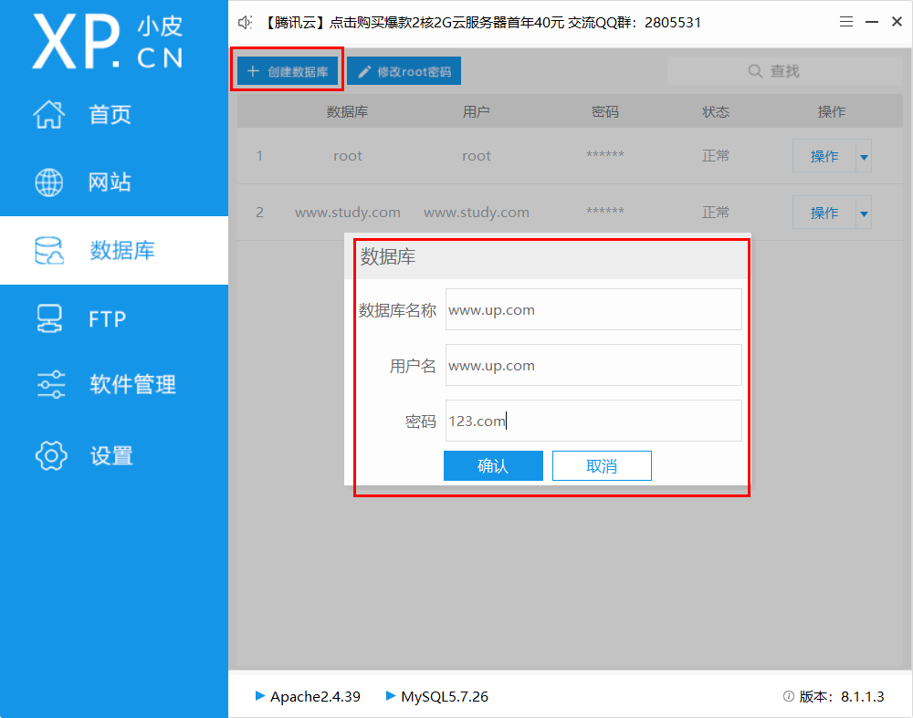 点击创建数据库的时候,会弹出数据库的创建(这个要记住,后面网站连接数据库的时候需要)
