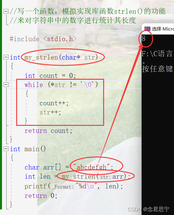 上述代码中,将字符串以数组的形式char arr[] = "abcdefgh";定义,通过函数my_strlen(arr),进行传递,然后在形参中,通过指针来接收,对于实参传递给形参的是首元素的地址,因此需要用指针来接收地址!而且又需要返回值,所以定义为: int my_strlen(char* str)