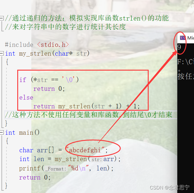 在这里面: else my_strlen(str + 1) + 1;意思就是判断读取的函数不是'\0'则进行+1;然后在通过 my_strlen(str + 1)对下一位字符进行读取判断,一直到遇见'\0'时为止!