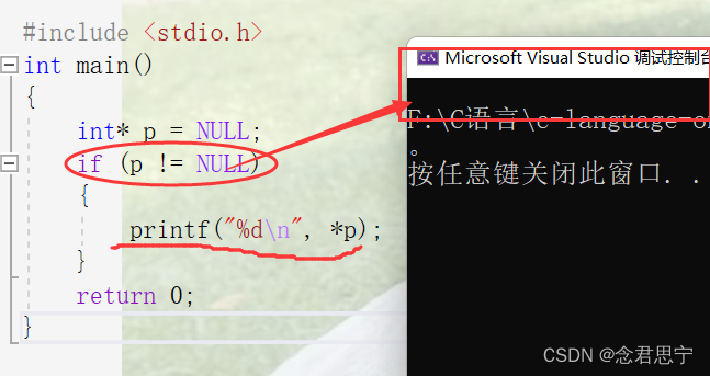 但如果不将*p进行NULL置空,将会出现程序报错的结果!直接不能运行,因此,及时将指针进行NULL置空,也是很有必要的!
