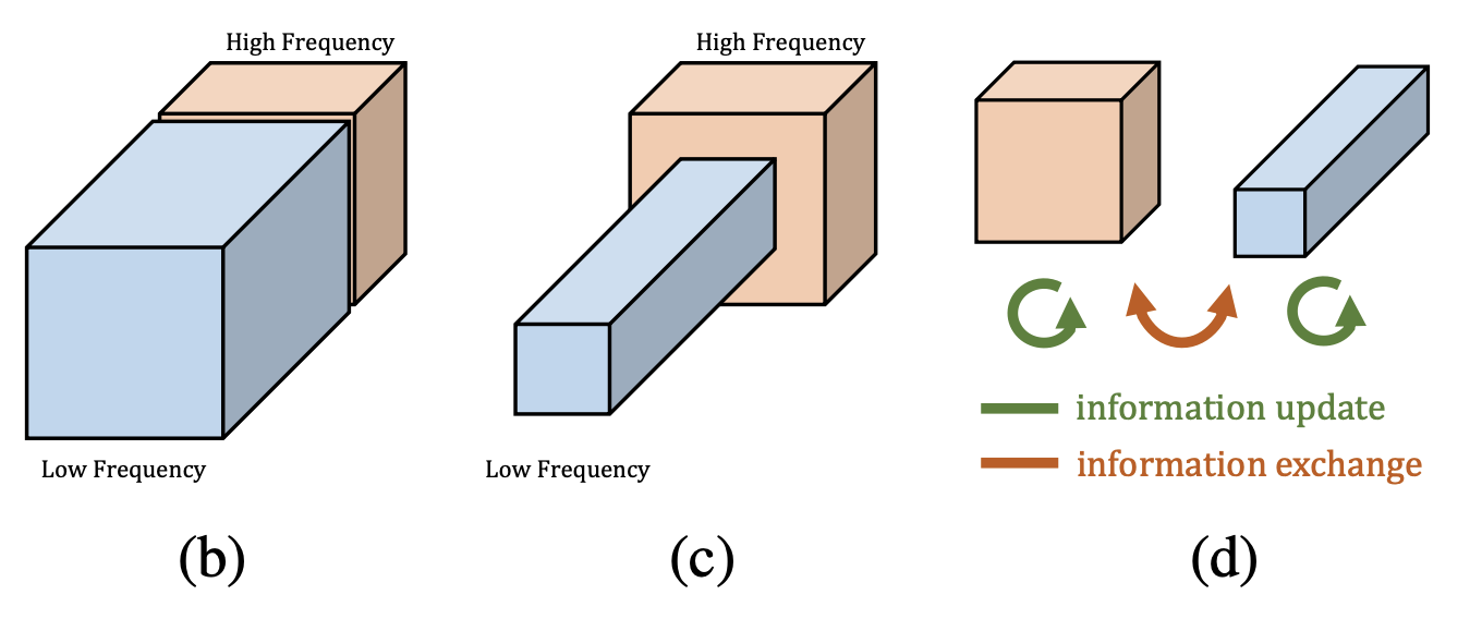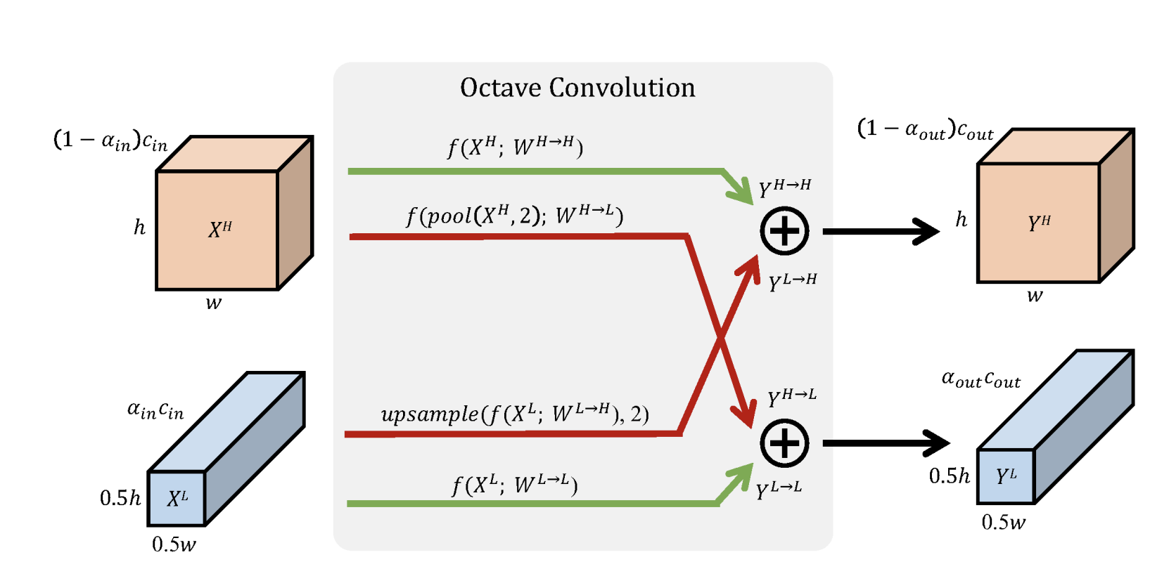 H和W分别表示特征图的长宽,可以看出低频特征图的长宽都是高频特征图的一半。因为分辨率不同,所以不同频率之间交流之前需要进行分辨率的调整:高频到低频需要进行池化(降采样)操作;低频到高频需要进行上采样操作。