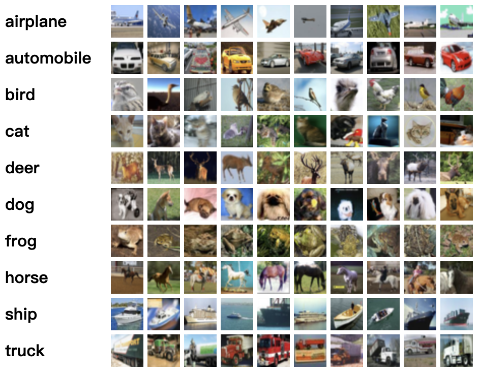 CIFAR-10 是由 Hinton 的学生 Alex Krizhevsky 和 Ilya Sutskever 整理的一个用于识别普适物体的小型数据集。一共包含 10 个类别的 RGB 彩色图 片:飞机( a叩lane )、汽车( automobile )、鸟类( bird )、猫( cat )、鹿( deer )、狗( dog )、蛙类( frog )、马( horse )、船( ship )和卡车( truck )。图片的尺寸为 32×32 ,数据集中一共有 50000 张训练圄片和 10000 张测试图片。 CIFAR-10 的图片样例如图所示。