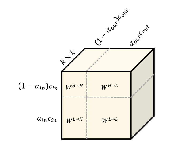 下图直观地展示了八度卷积的卷积核,可以看出四个部分共同组成了大小为 k*k 的卷积核。其中,in和out分别表示输入和输出特征图的相关属性,在这篇文章中,输入的低频占比、通道数量都和输出的一致。