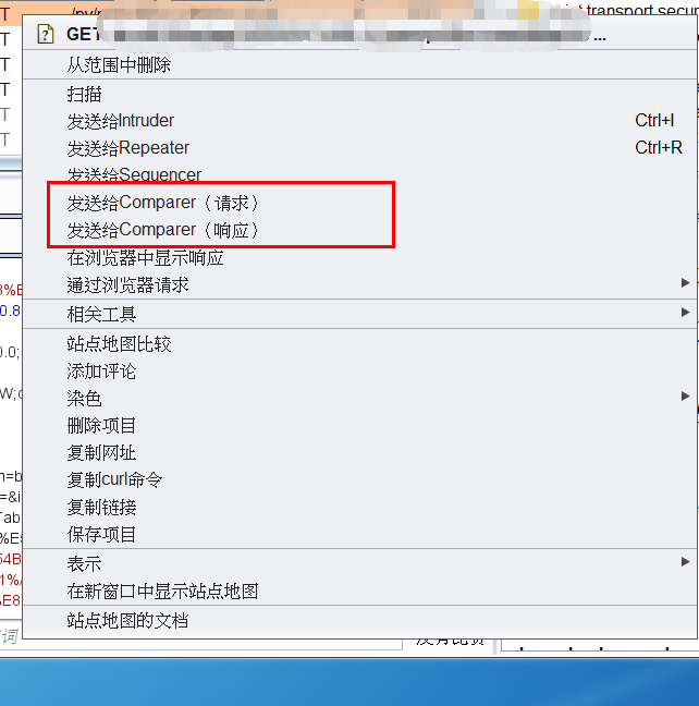 可以选择截取的URL,或在site map(网站地图中的URL)然后点击右键,再点击发送到compare进行对比