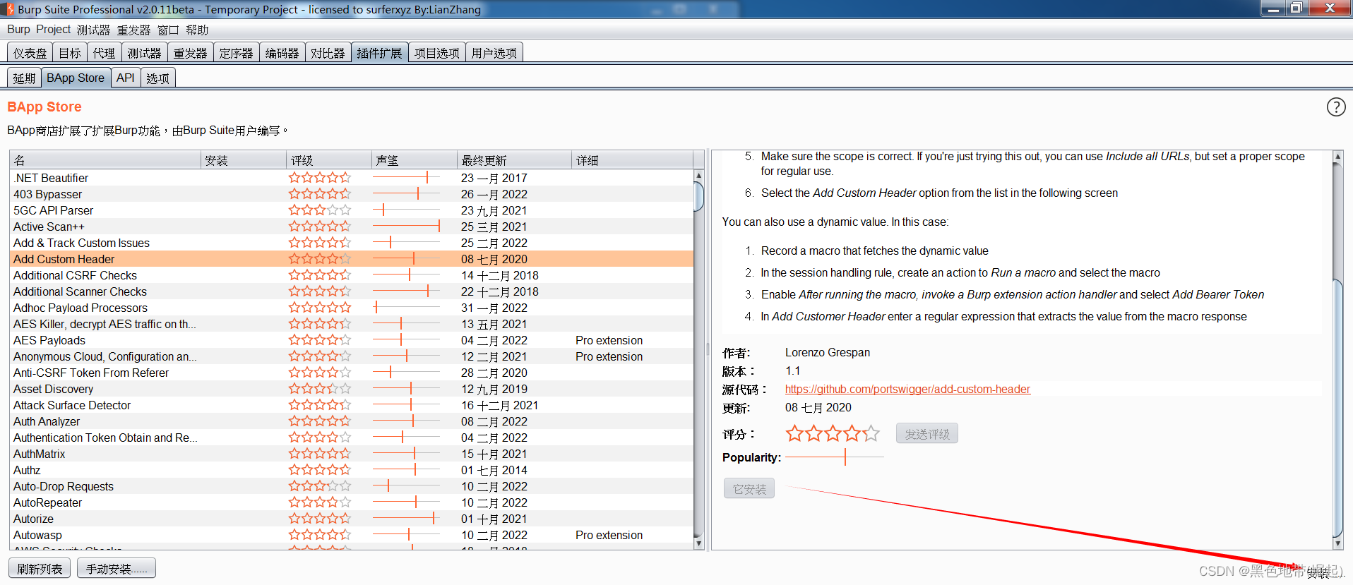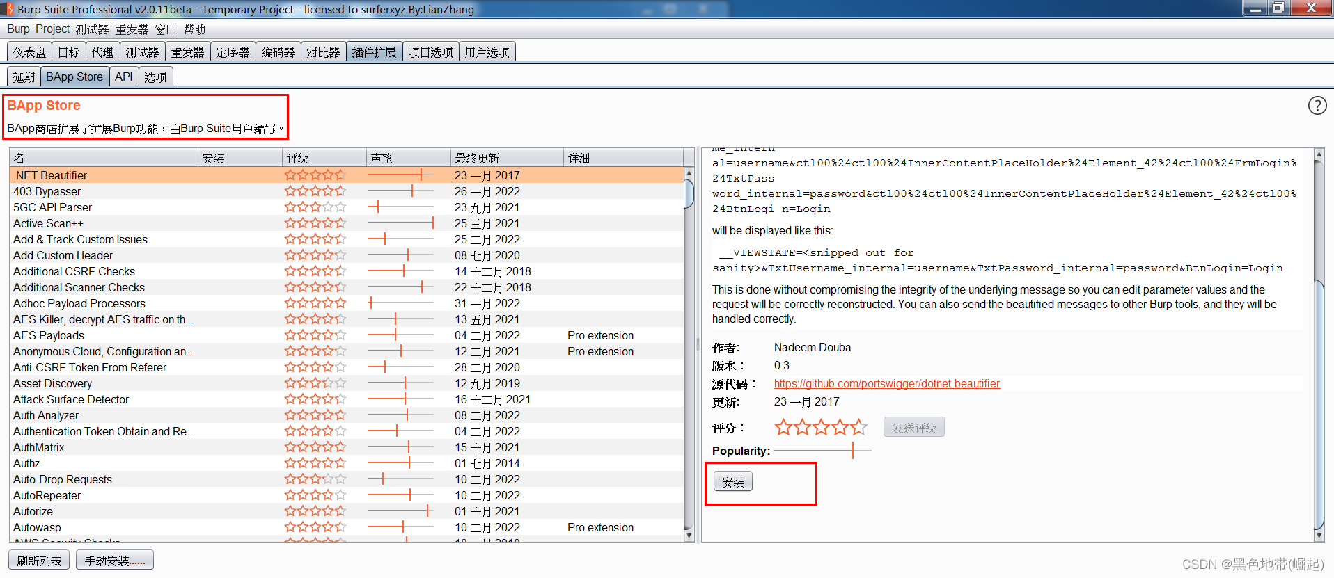 在BApp Store中有各种插件的应用列表,当点击某个插件后,右侧会显示次插件的相关一些介绍等信息。 可以点击左下方的install(安装)按钮,进行安装