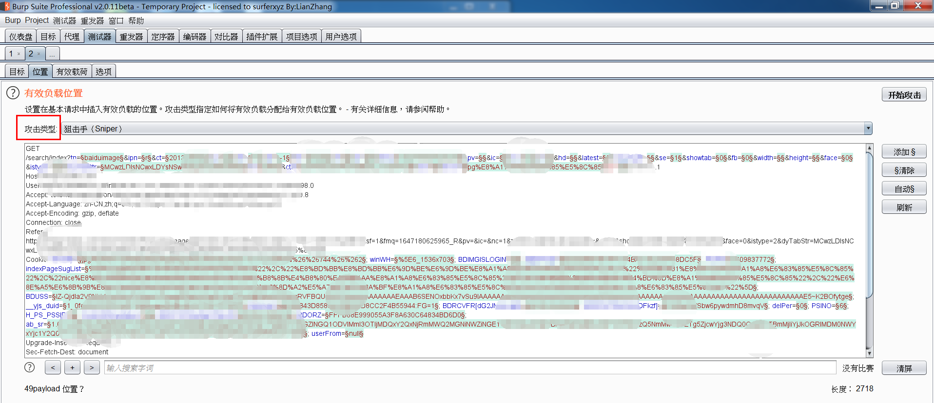 每对 ‘ § ’标记的内容是一个Payload位置。有效载荷位置被分配了Payload时,标记和任何包含的文本都将被Payload替换,当有效载荷位置没有指定的Payload时,标记§将被移除。