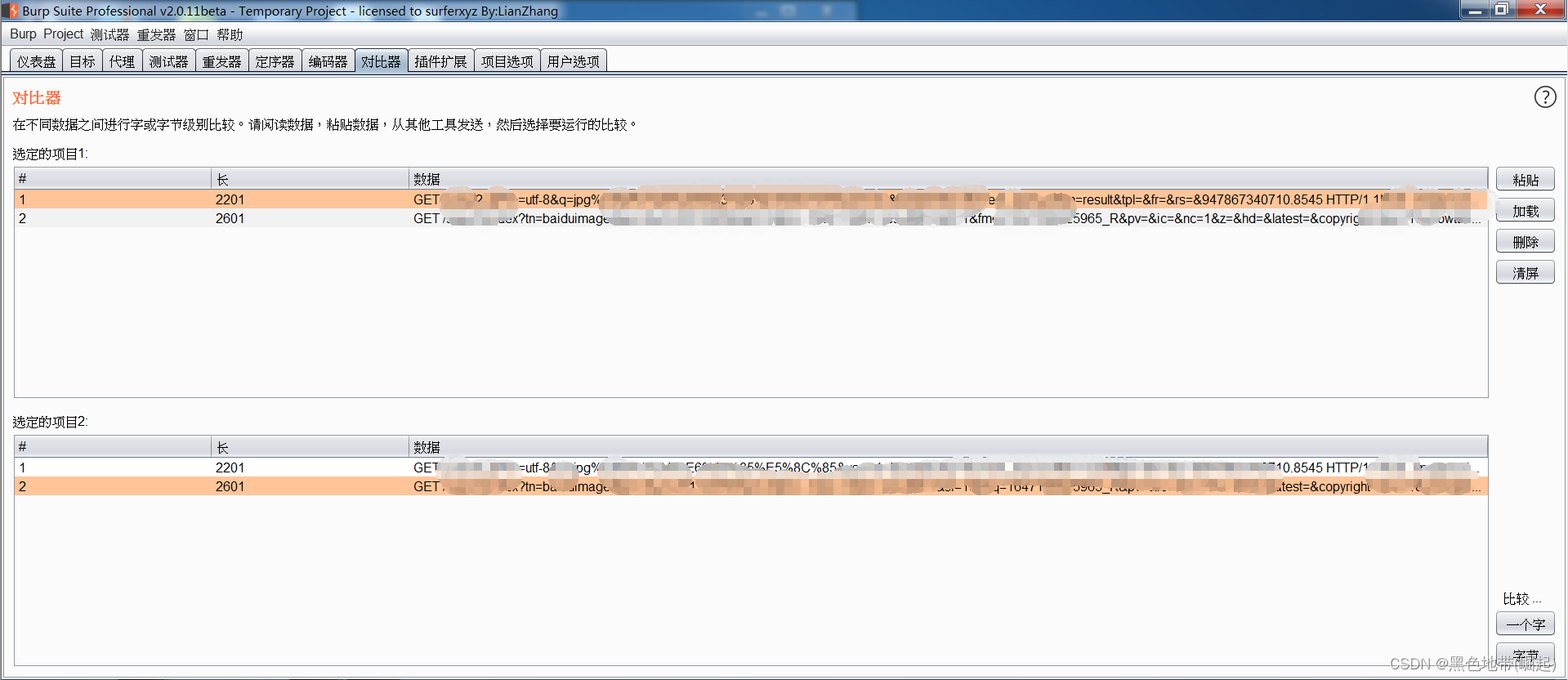 可以再点击加载本地的数据包进行对比,也可以再去找到一个或多个URL数据包发送到comparer再进行对比(比较一个字/字节)