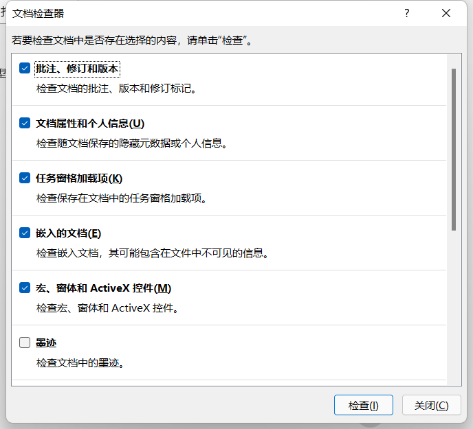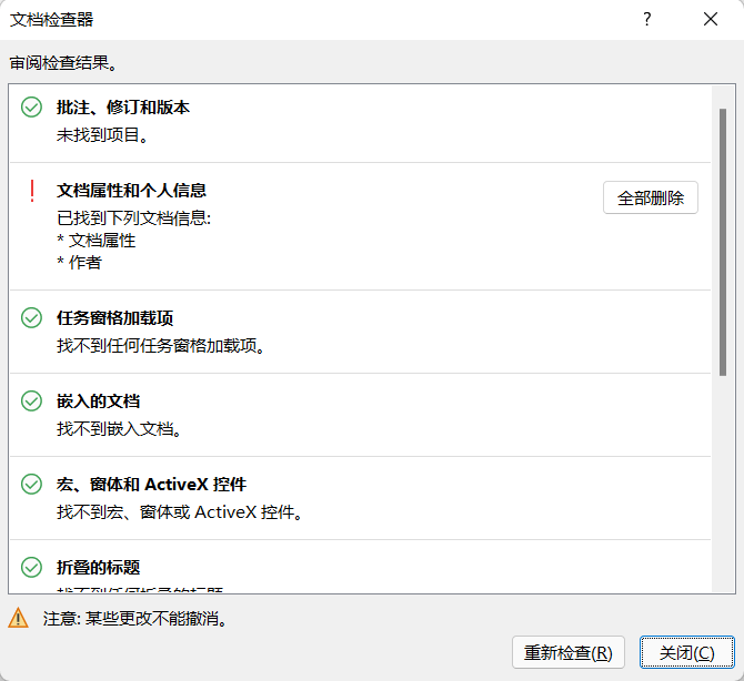 另一个识别隐藏文字的方法是使用 " Inspect Document" 选项。 路径是 "File-----+ Info -----+ Check For Issues -----+ Inspect Document" 。 使用文档检查器是检查文档中隐藏的各种元数据的一个好方法, 可以识别作者、 批注和其他可识别个人的信息 (Personal Ident巾able Information, PII) 。 此外, 它还能用来检查隐藏文字