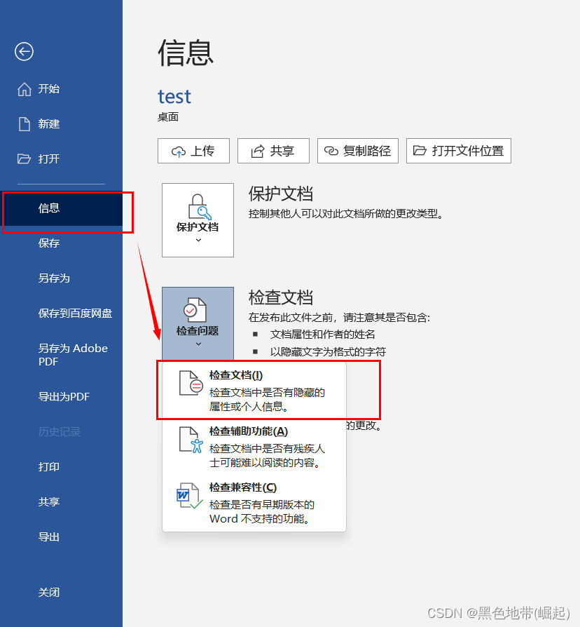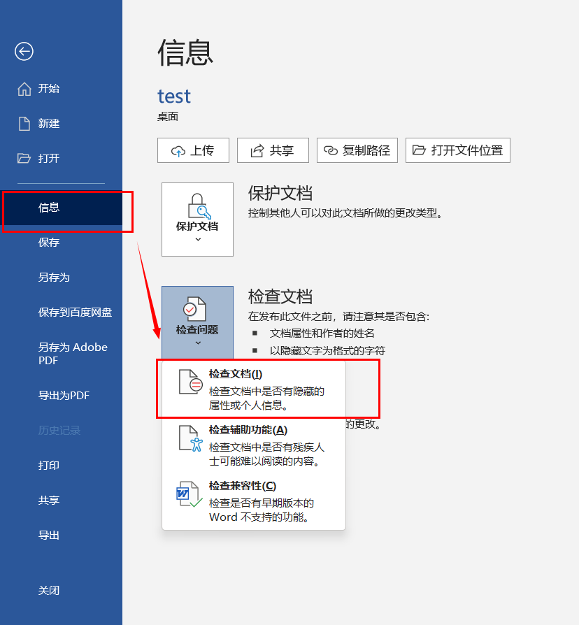 点击文件------>点击信息------>点击检测问题-------->点击检查文档------>检查