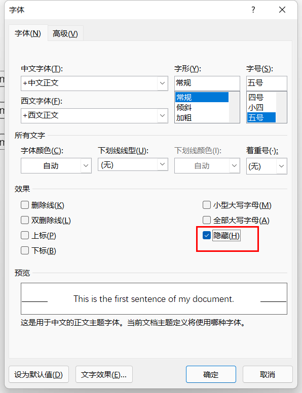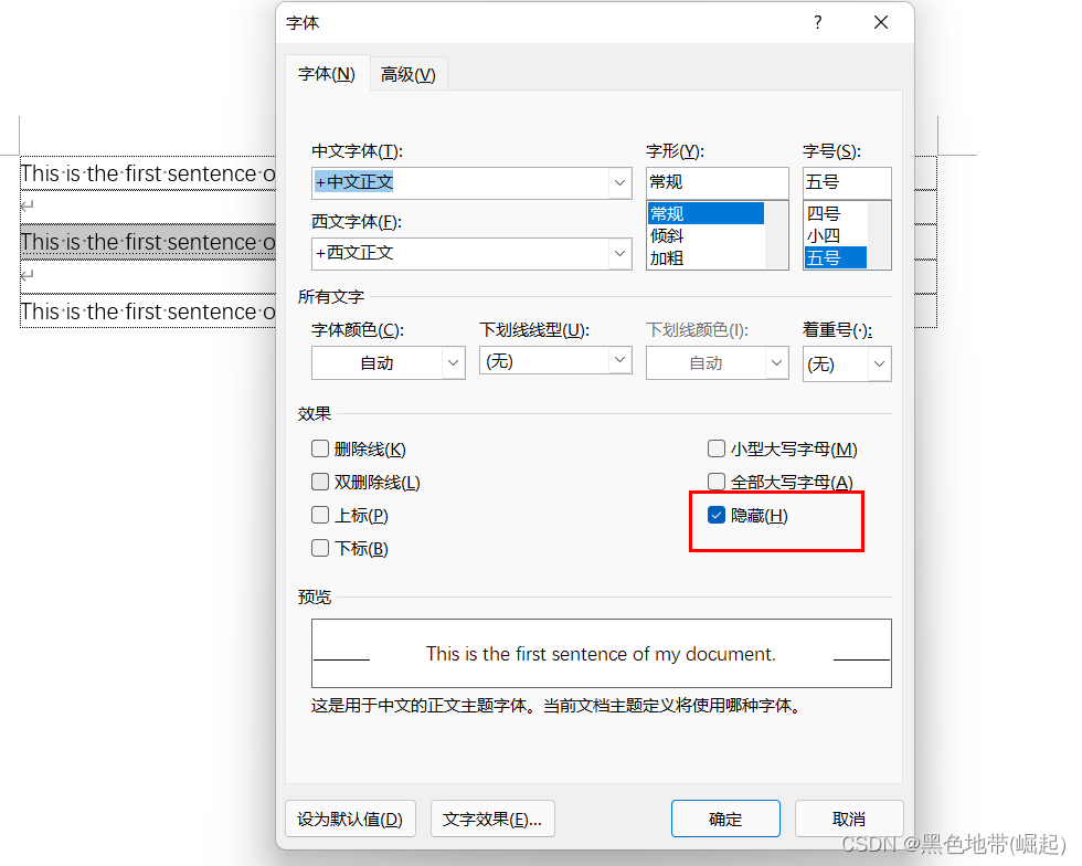 先选中要隐藏的文字----->开始---->字体里更多高级选项------> 点击隐藏