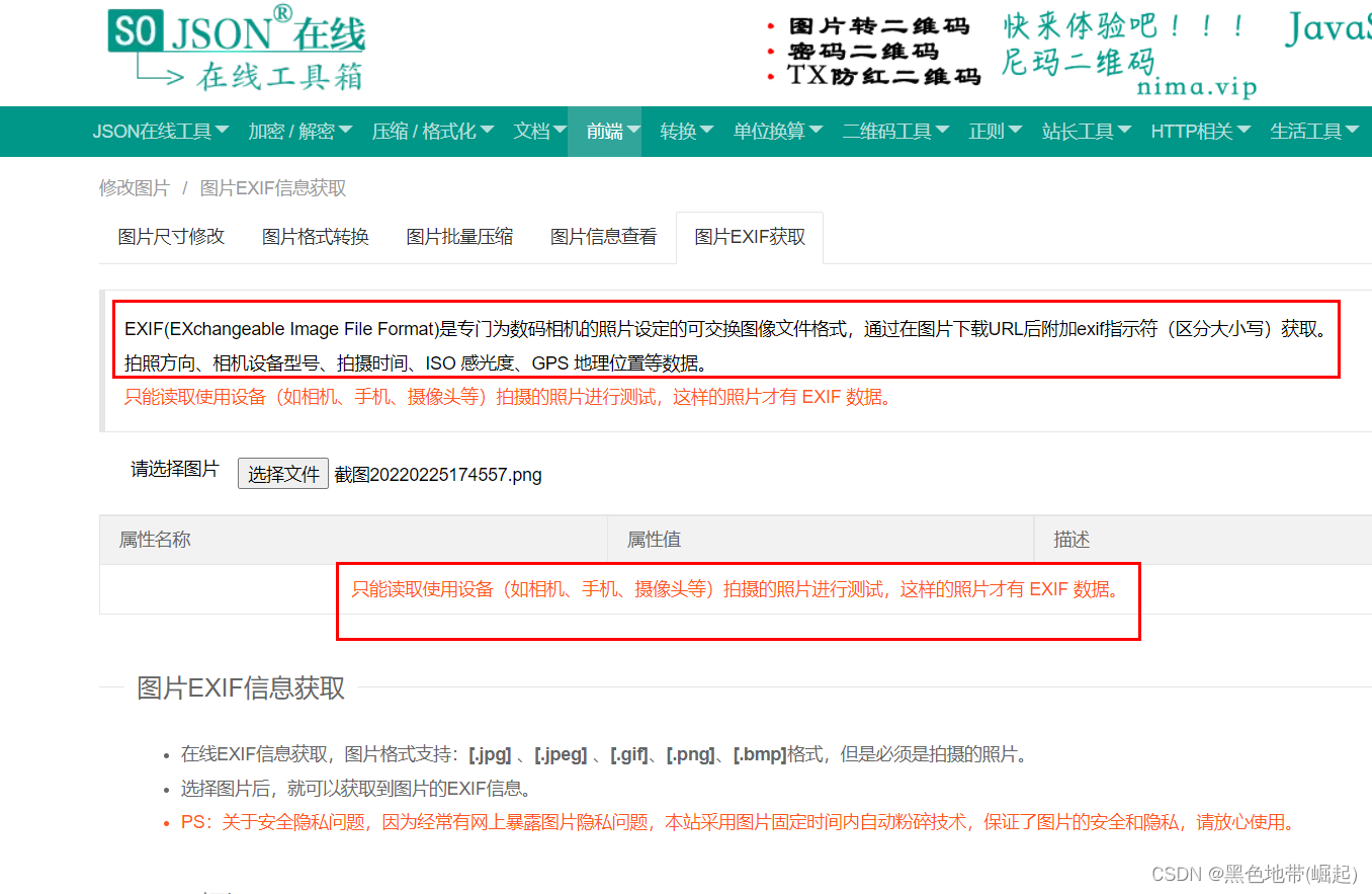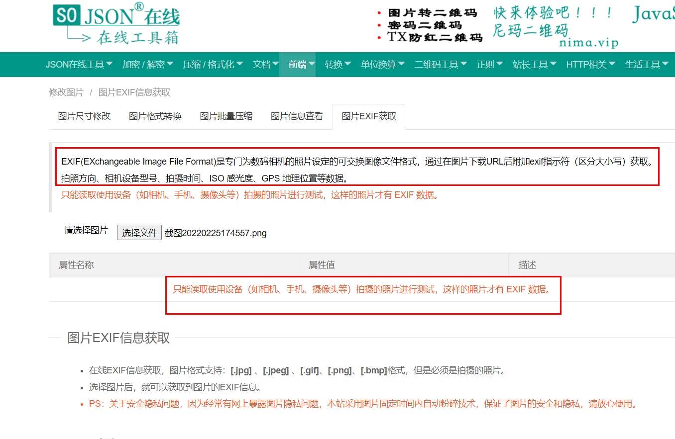 (只能读取使用设备(如相机、手机、摄像头等)拍摄的照片进行测试,这样的照片才有 EXIF 数据。)