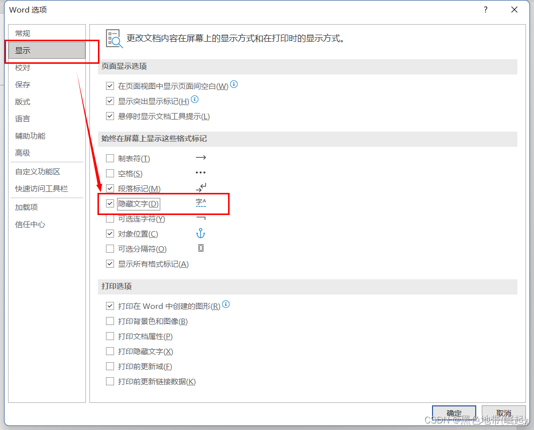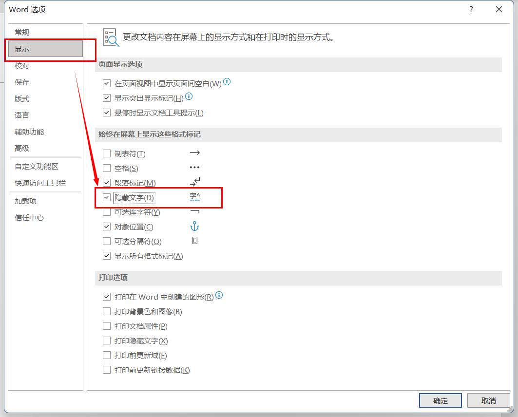 点击文件------>点击选项------>在显示里勾选隐藏文字