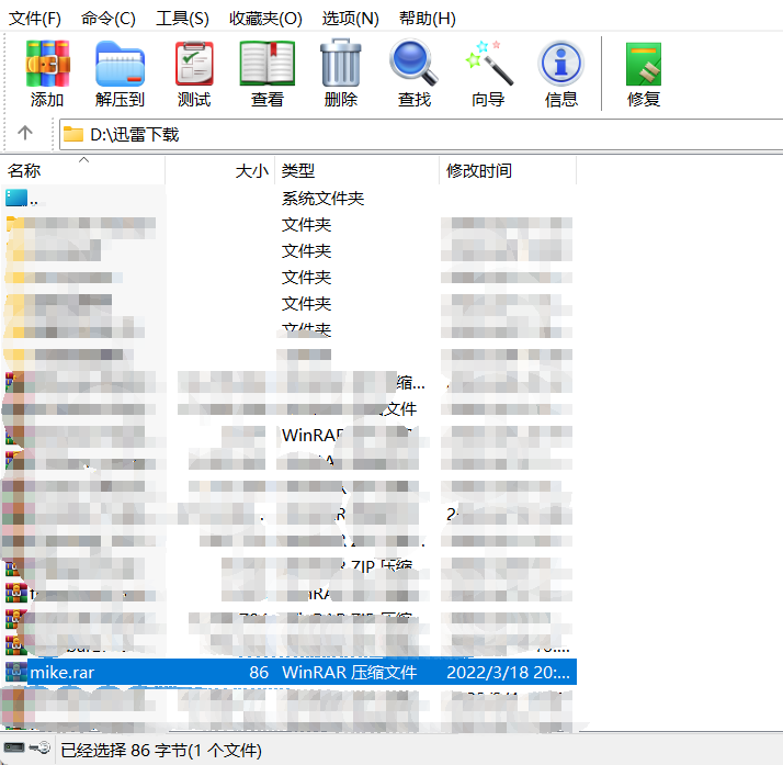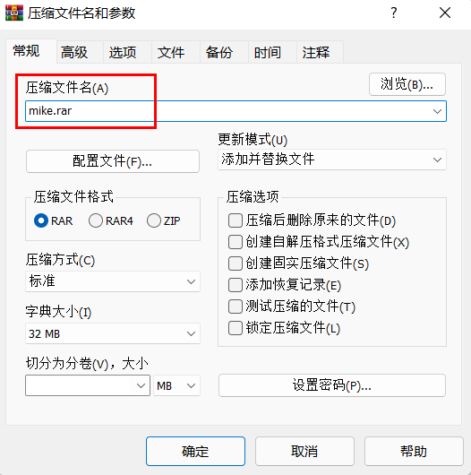 然后参考下面的内容新建一个包含 "mike.txt" 的压缩文件 "mike.rar "。打开WinRAR, 选择 "Add" 添加需要隐藏的文件(mike.txt)创建一个新的压缩文件