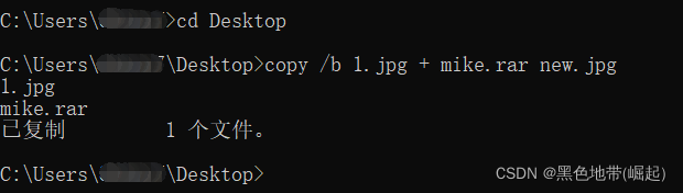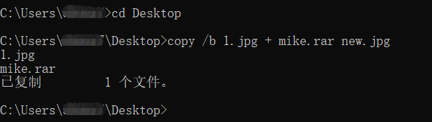 我选择一个普通的 图像"1.JPG "作为载体。 在 DOS 命令行中使用 copy 命令, 加上/b选项把图像 文件作为二进制文件处理, 并用"+" 号来组合两个文件(作为载体的图像文件"1.JPG" 和待隐藏的压缩文件 "mike.rar"), 然后指定输出文件名为 "newimage.JPG"