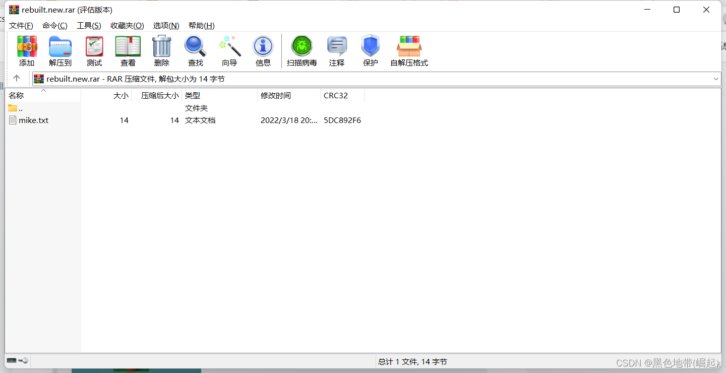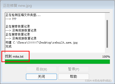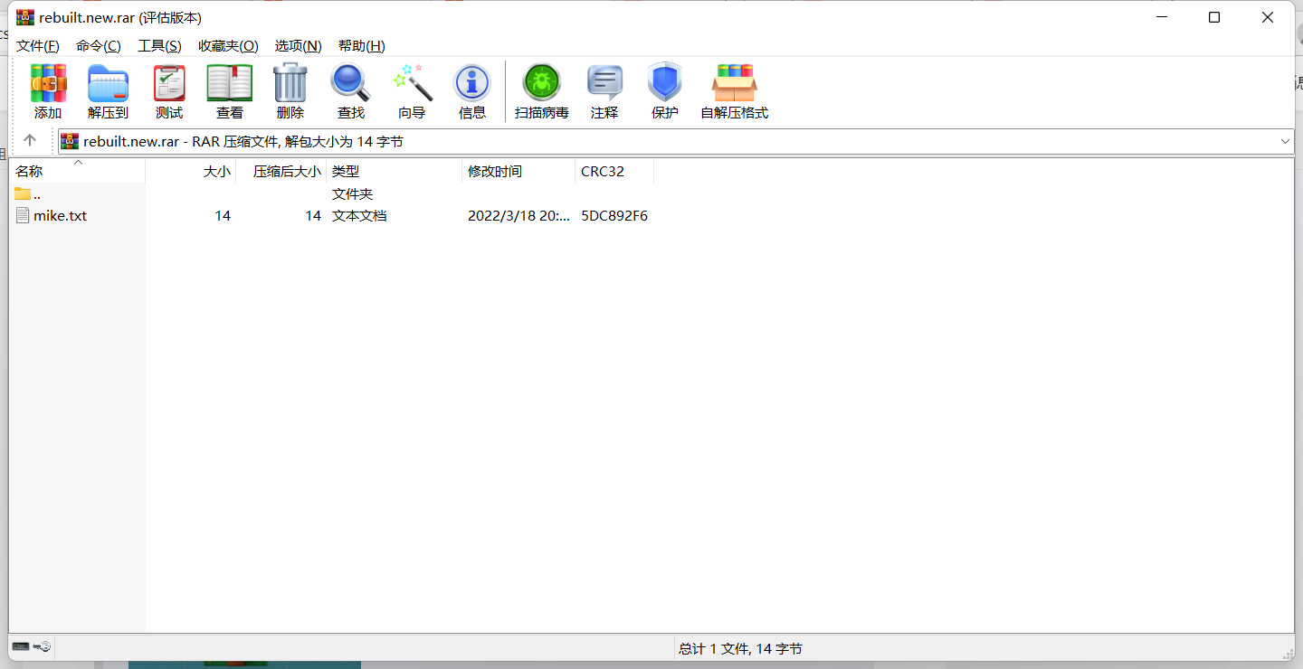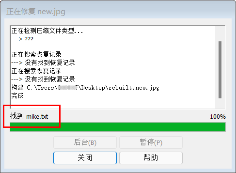 修复完成后, WinRAR 会 ”重构” 一个名为 " rebuilt.newimage.rar" 的压缩文件, 同时提示我们该文件中包含 "mike.txt" 。
