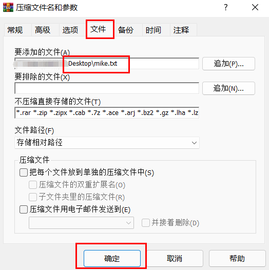 在 "Files" 页签中的 "Files to add" 对话框中选择包含隐藏消息的mike.txt文件, 然后单击 "OK" 按钮, 创建"mike. rar " 文件