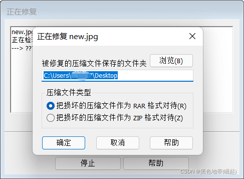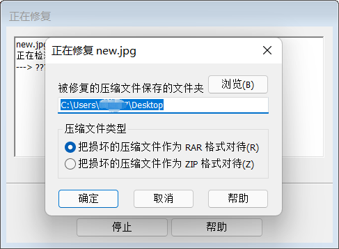 (下面操作是对new.rar进行修复,如果转换为.RAR再继续操作,会像我下面继续的操作那样,但是最后再改后缀就可以解决问题)