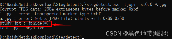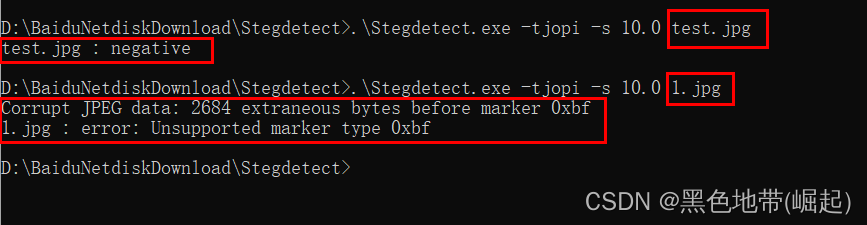 ①.\Stegdetect.exe -tjopi -s 10.0 test.jpg