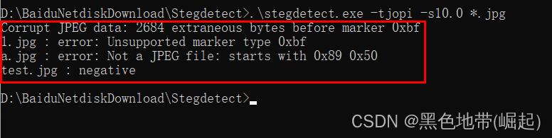 ①.\Stegdetect.exe -tjopi -s 10.0 test.jpg