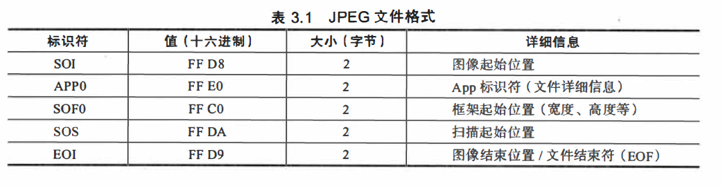 以JPEG文件为例,我们最多可以在其中 插入65533个字节的批注信息,而这些内容在浏览图像的时候都是看不到的。JPEG文件被文件标识符分成不同的区域,每个标识符都以OxFF开头。这些标识符标识着文件的布局、格式和其他详细信息,具体如表3.1所示。