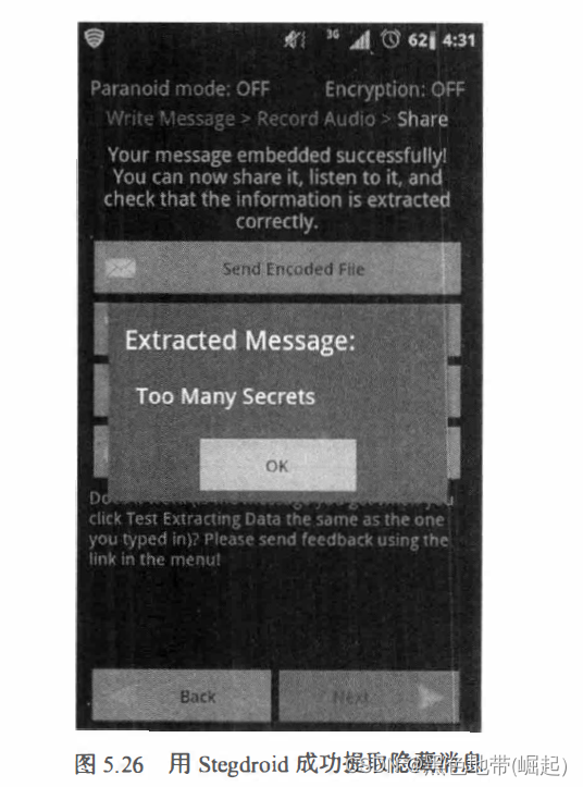 数据嵌入完成后,Stegdroid会提醒用户是否对消息进行解码来校验其有效性、试听音频,然后通过邮件或其他应用程序将消息发送出去。