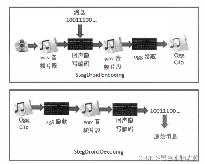 需要隐藏哪个数值(0或1), Stegdroid就使用相应的算法。提取编码数据的时候,检测或提取算法会检查回声消息并判断回声类型是“1”还是“0”并记录这些值。这个检查和录制过程会不断重复,直到整片音频检测完成。嵌入数据后的音频格式是一个开放的容器格式 ogg (一种主要用来传输多媒体对象的高效媒体流)
