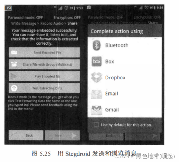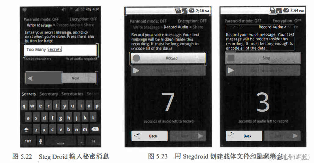 检测或阻塞ogg文件很简单,但是ogg文件在Android设备中是一个应用非常普遍的合法文件,特别是用于铃声的交换,此外,Stegdroid还有其他功能:在嵌入数据前对消息进行加密,在发送后将Android设备中残留的相关消息删除掉