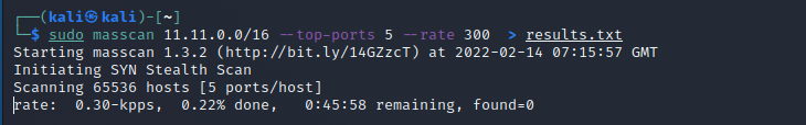 sudo masscan 11.11.0.0/16 --top-ports 5 --rate 300 > results.txt