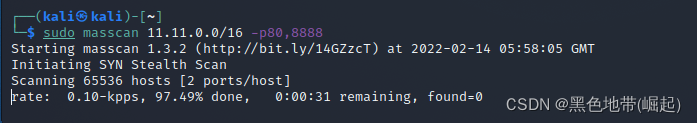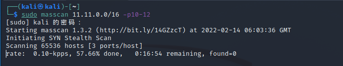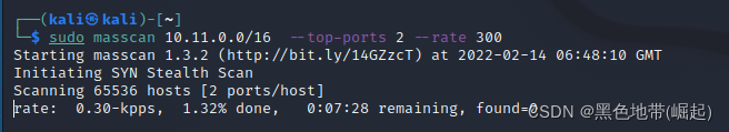 sudo masscan 11.11.0.0/16 --top-ports 2 --rate 300