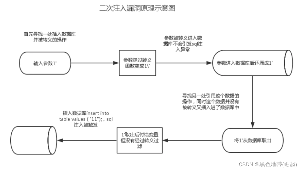 攻击者构造恶意的数据并存储在数据库后,恶意数据被读取并进入到SQL查询语句所导致的注入。防御者可能在用户输入恶意数据时对其中的特殊字符进行了转义处理,但在恶意数据插入到数据库时被处理的数据又被还原并存储在数据库中,当Web程序调用存储在数据库中的恶意数据并执行SQL查询时,就发生了SQL二次注入。