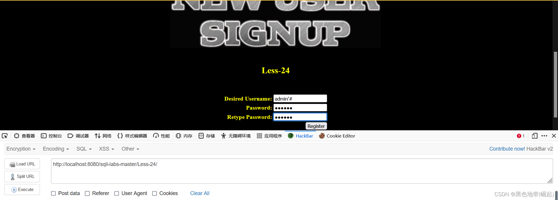 第二步:通过注册新用户,将语句注入数据库