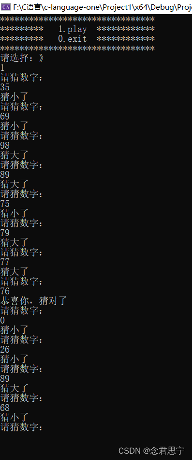 首先;我们需要有一个菜单,来进行对我们玩家的指导;其次生成随机数,利用了rand和srand函数,int ret = rand() % 100 + 1; //0到99———》+1变成0到100,利用这个过程,(具体注释我想读者应该可以看懂,就不做过多解释)实现了1到100随机数的生成,在一定范围内的次数,将不会重复!