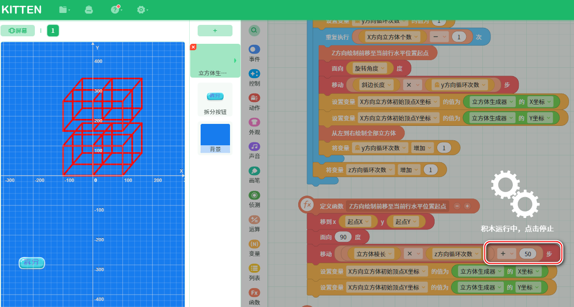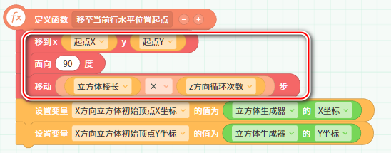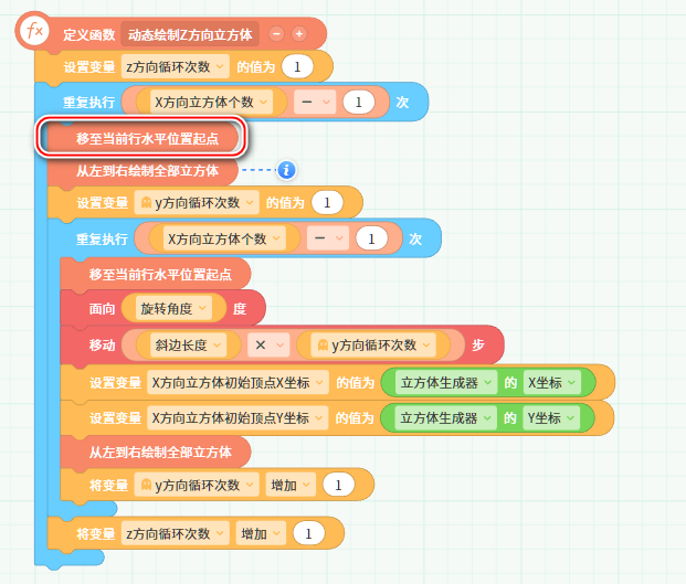 从内层循环的移动斜边长度积木,我们就能知道这个积木的作用是沿着斜边不断移动正方体初始顶点的 X 和 Y 坐标,从而完成当前这一层(z方向)的所有立方体绘制。