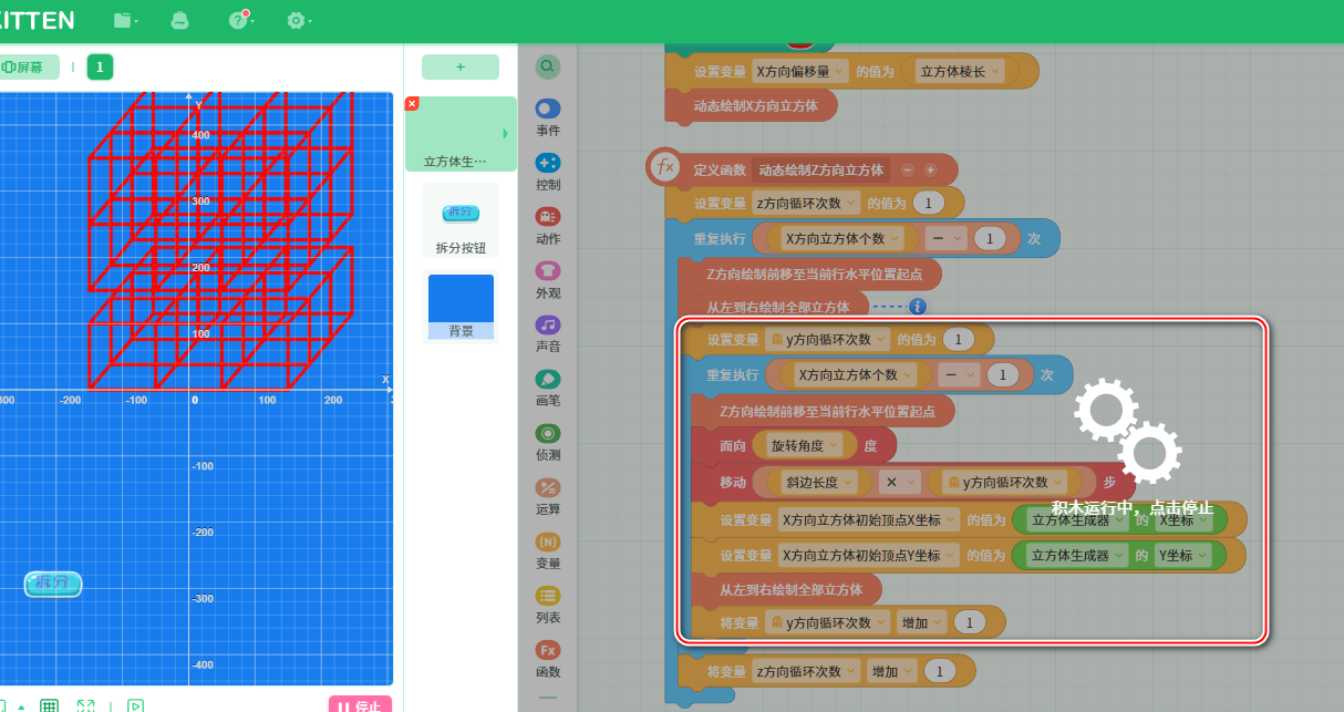 然后在这一轮的 Z 方向循环体内,引入一个嵌套的循环,在嵌套循环里,将这一层 Y 方向的立方体全部绘制完毕: